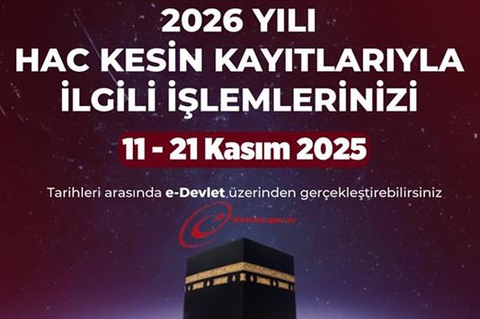 2026 yılı hac kesin işlemlerinizi, 11 Kasım 2025 Salı günü (Yarın) Saat 09.00'dan itibaren e-Devlet @ekapi üzerinden yapabilirsiniz.