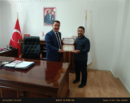 Diyanet İşleri Başkanlığı tarafından düzenlenen 2025 Yılı 4. Dönem hafızlık tespit sınavına girerek başarılı olan Selim UZUN hocamıza Başkanlığımız tarafından gönderilen hafızlık icazet belgesi İlçe Müftümüz Muhsin YILDIZ tarafından teslim edildi.