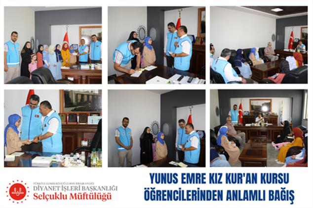 Yunus Emre Kız Kur'an Kursu öğrencileri Selçuklu Müftülüğü 'nün geçen yıl başlatmış olduğu ve bu yıl 12 ay boyunca devam edecek olan "Selçuklu Yetimine Sahip Çıkıyor Bir Yetim de Sen Okut" projesine destek olmak için toplamış oldukları harçlıkları Selçuklu Müftü V. Bahtiyar Şahin'in makamında TDV Selçuklu Şube temsilcisi Hadi Ülgen'e teslim ettiler.