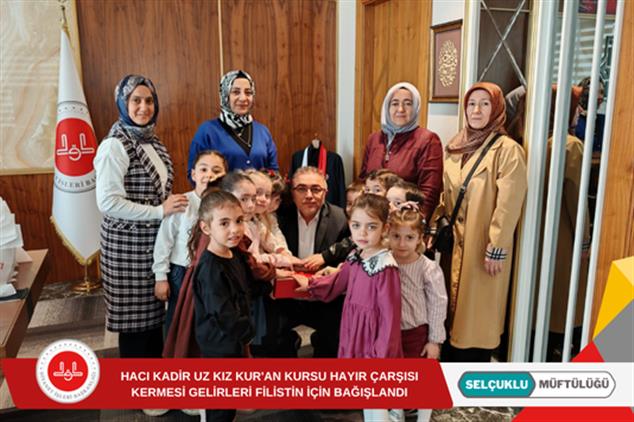 Hacı Kadir Uz Kız Kur'an Kursunun katkılarıyla kurulan hayır çarşısı kermesinden elde edilen gelir, Filistinli kardeşlerimizin ihtiyaçlarında kullanılmak üzere, 4/6 yaş sınıfı minik öğrenciler tarafından İlçe Müftümüz Selim Yazıcı'ya teslim edildi.