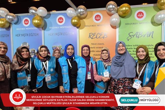 ŞİVLİLİK ÇOCUK BAYRAMI ETKİNLİKLERİNDE SELÇUKLU KONGRE MERKEZİNDE SÖYLEŞİYE KATILAN YAZAR SALİHA ERDİM HANIMEFENDİYİ, SELÇUKLU MÜFTÜLÜĞÜ ŞİVLİLİK STANDIMIZDA MİSAFİR ETTİK.