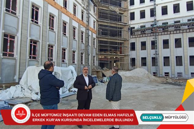 İlçe Müftümüz Selim Yazıcı, inşaatı devam Elmas Hafızlık Erkek Kur'an Kursunda incelemelerde bulunarak, dernek yöneticisi Mustafa Selek ve görev yapan teknik personelden bilgiler aldı.