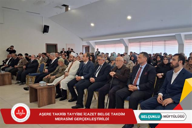 Selçuklu Müftülüğü ile Hacıveyiszade İlim ve Kültür Vakfı iş birliğinde, Şeyhü'l Kurra Mithat Aça ve Hacıveyiszade Cami Başimam Hatibi Mehmet Çaba'nın riyasetinde eğitimleri tamamlanan kursiyerlere “Aşere Takrib Tayyibe İcazet Belge Takdim Merasimi” yoğun bir katılımla gerçekleştirildi.