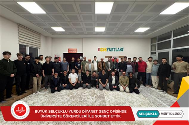 İlçe Müftümüz Selim Yazıcı, Selçuk Üniversitesi kampüsünde bulunan Büyük Selçuklu Yurdu Diyanet Genç Ofisi'nde üniversite öğrencileri ile akşam sohbetinde bir araya geldi.