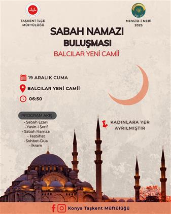 Taşkent İlçe Müftülüğü tarafından düzenlenen Sabah Namazı Buluşması programımıza tüm halkımız davetlidir.
